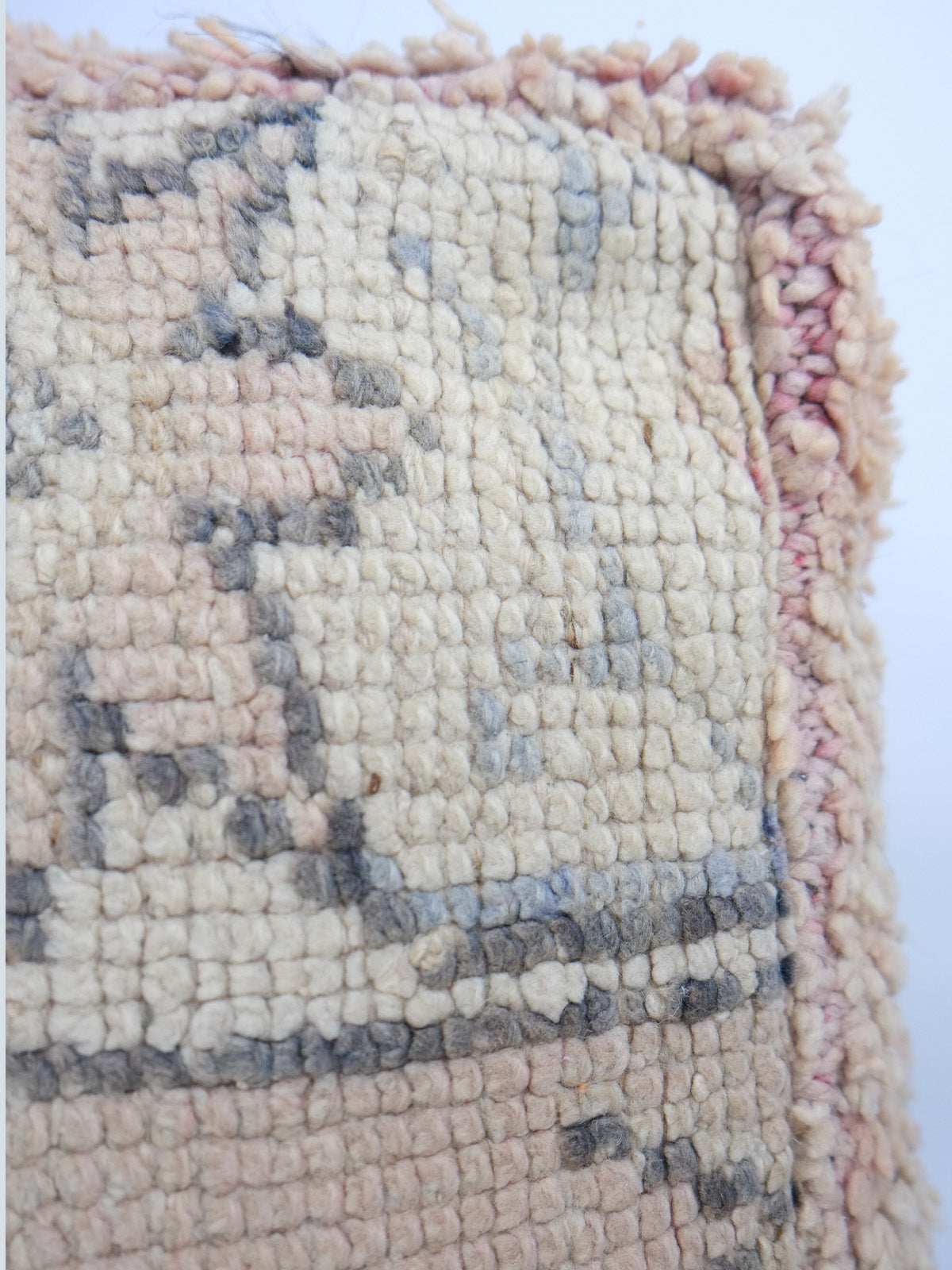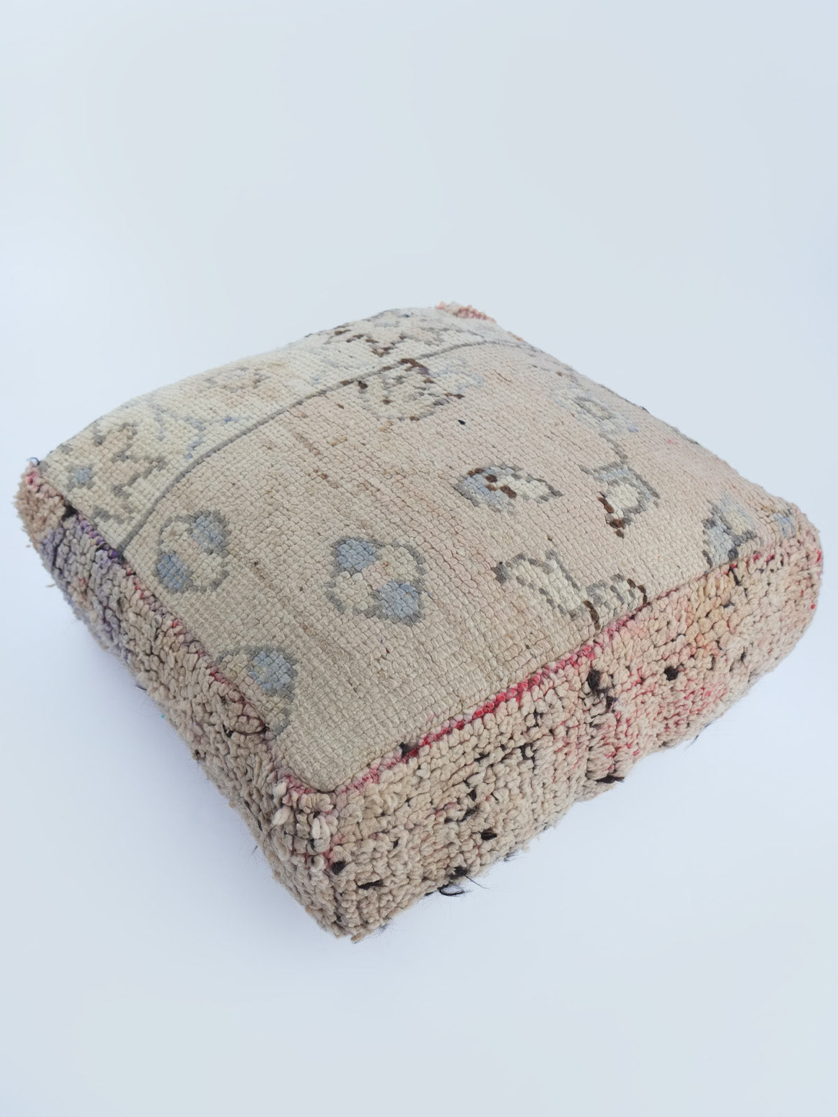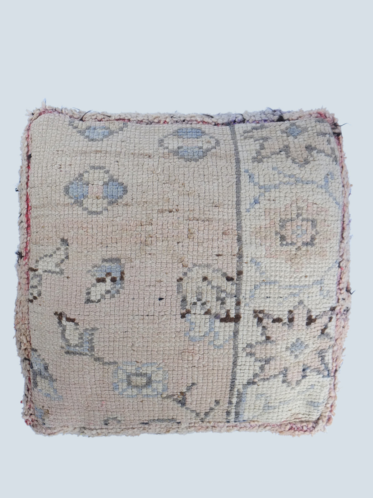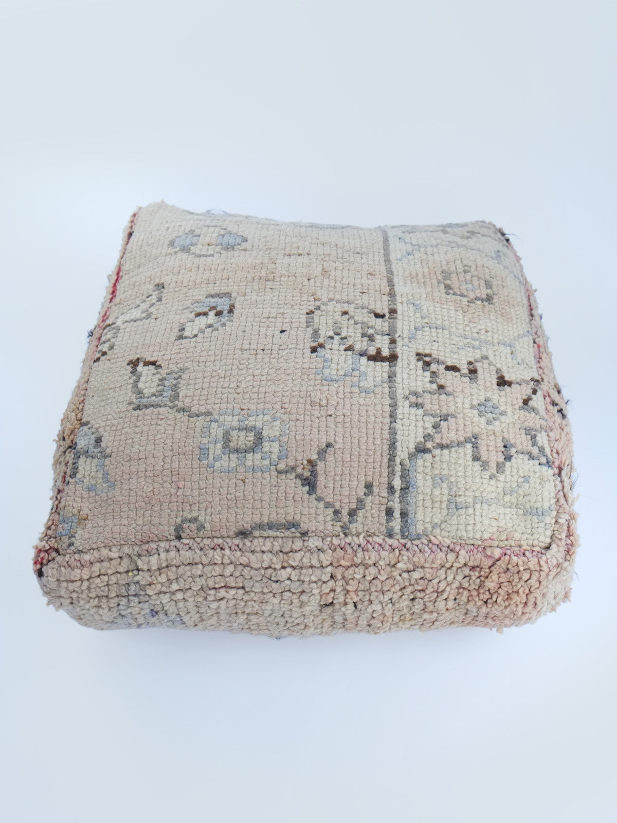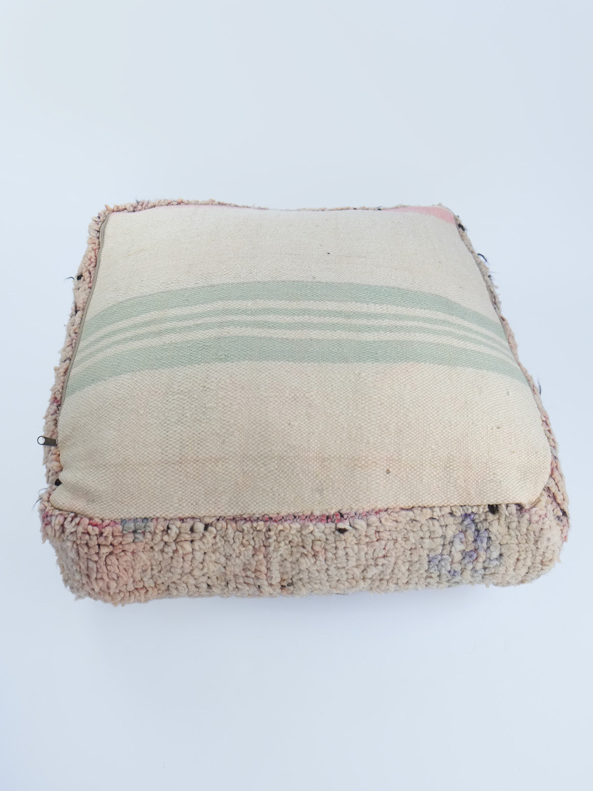 This one-of-a-kind floor cushion is made using 100% wool Boujad rug fabric. The top panel features a floral vine design in muted pinks with accents of soft blue and beige. The sides panels are tonally similar deeper pile. A sturdy cream cotton backer with green and pink stripes completes the cushion.