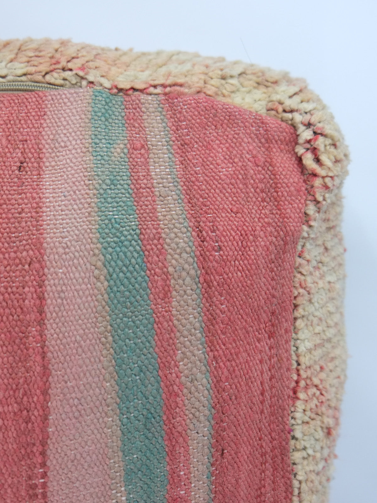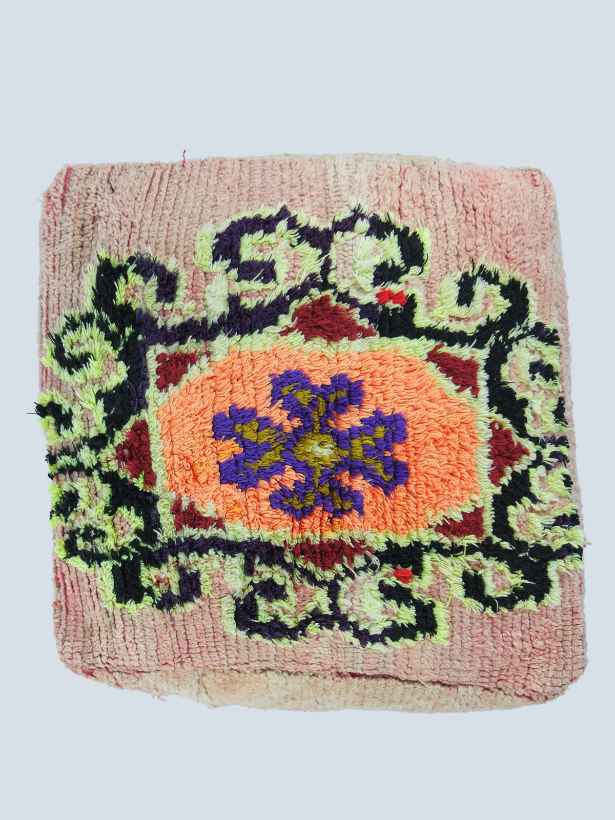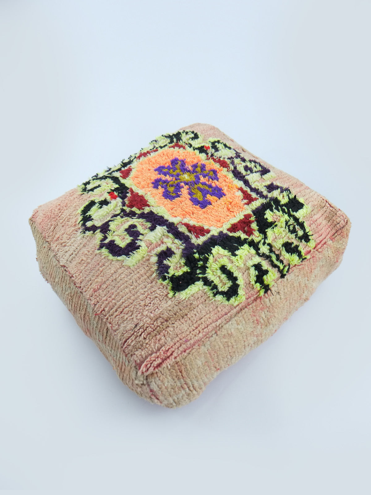 This one-of-a-kind wool floor cushion is made using Boujad rug fabric in petal pink with a central floral design in contrasting bright shades . The cushion is finished with a strong, striped cotton base of muted reds and soft greens.