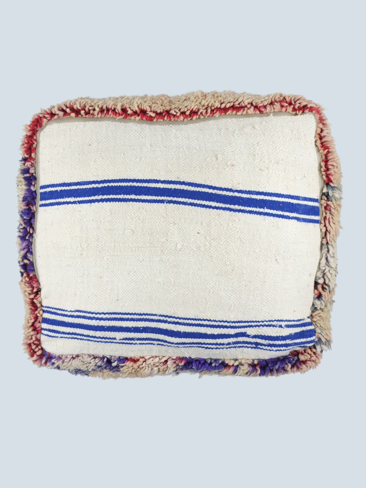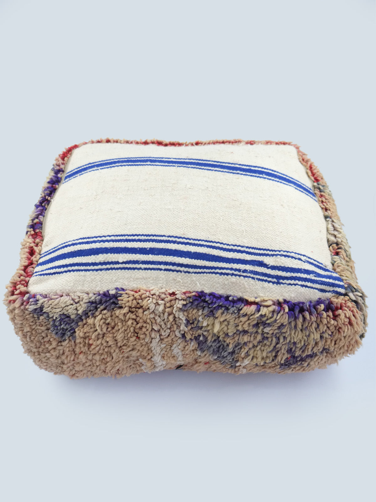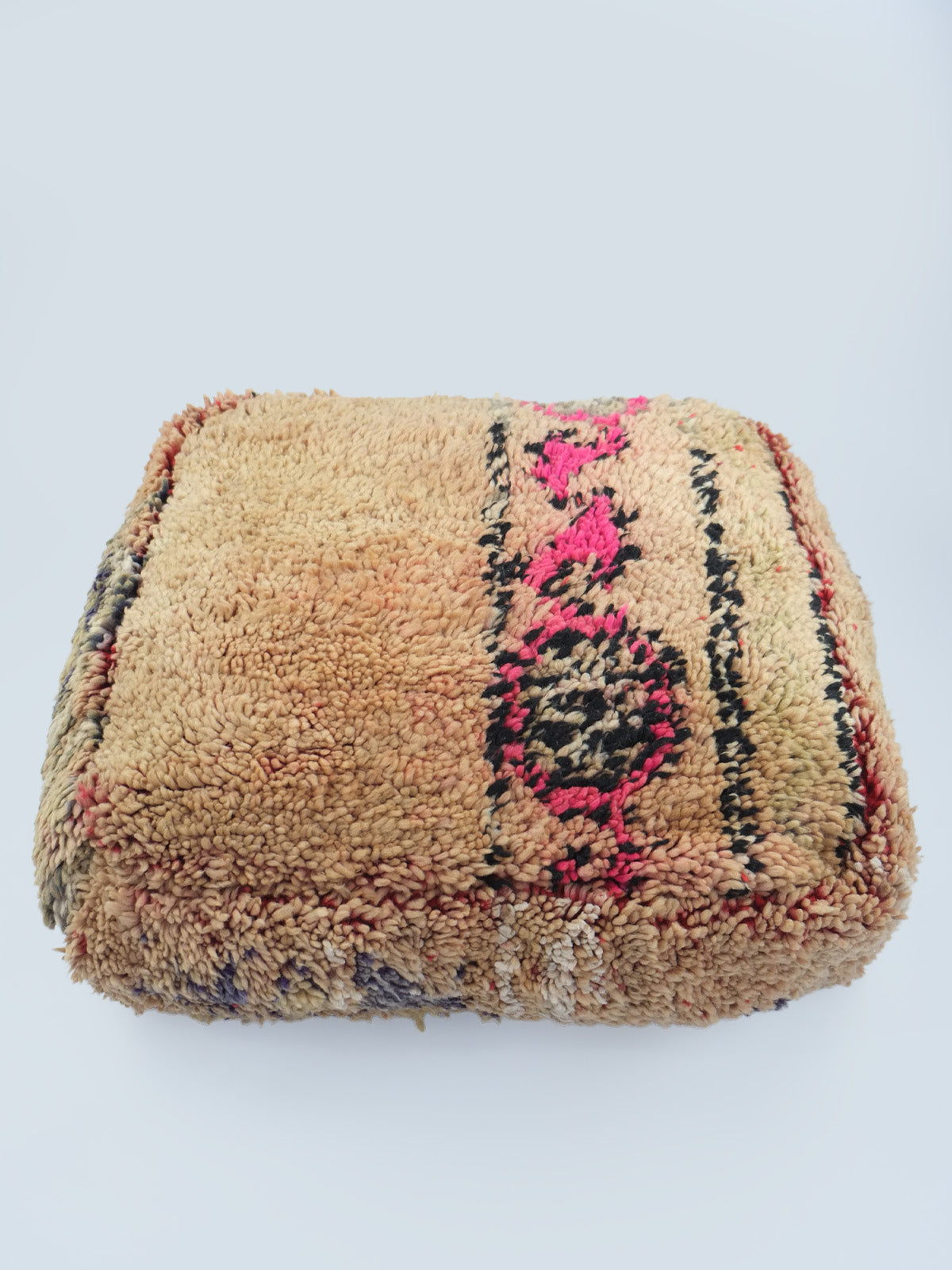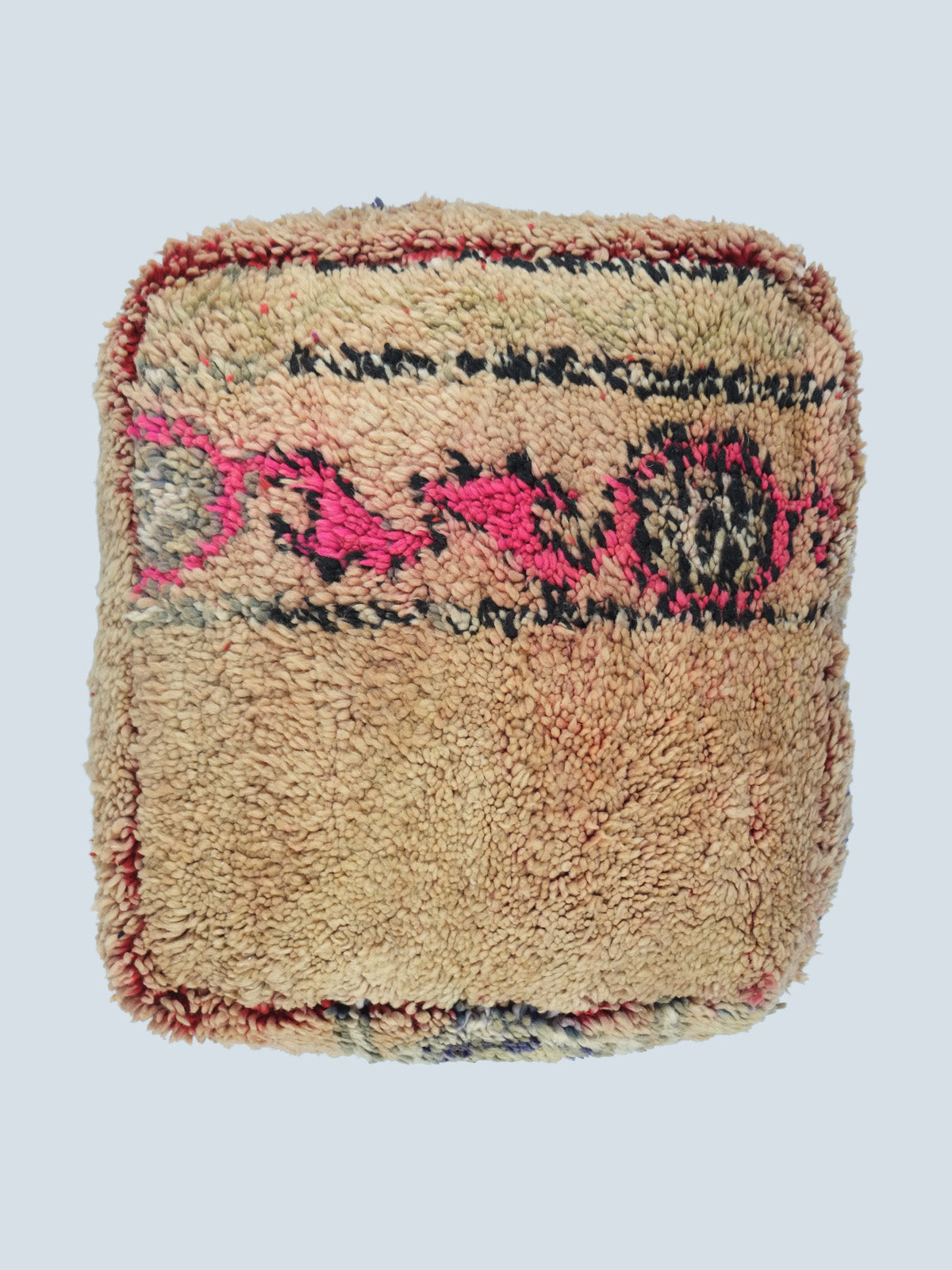 This one-of-a-kind wool floor cushion is made using Boujad rug fabric blush beige with a hot pink border motif to one side. The cushion is finished with a strong, cream cotton base with pink and green stripes.
