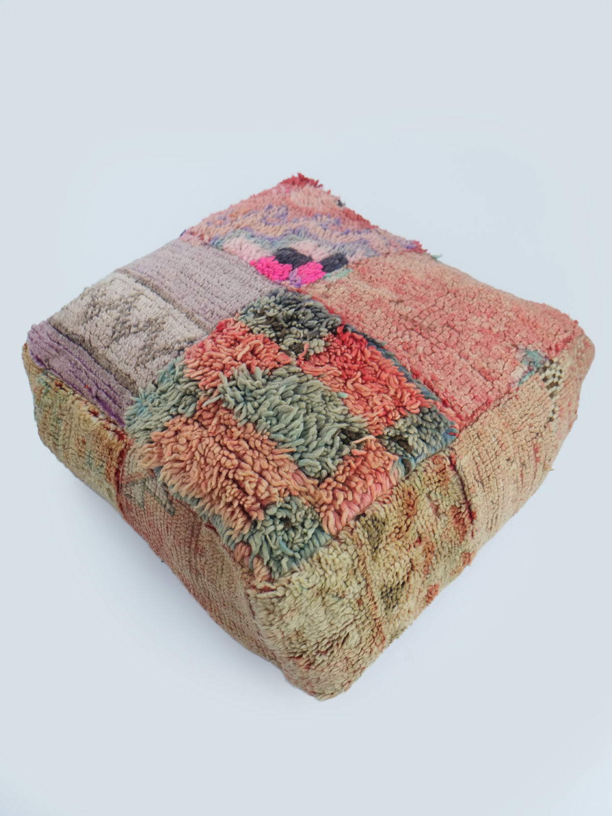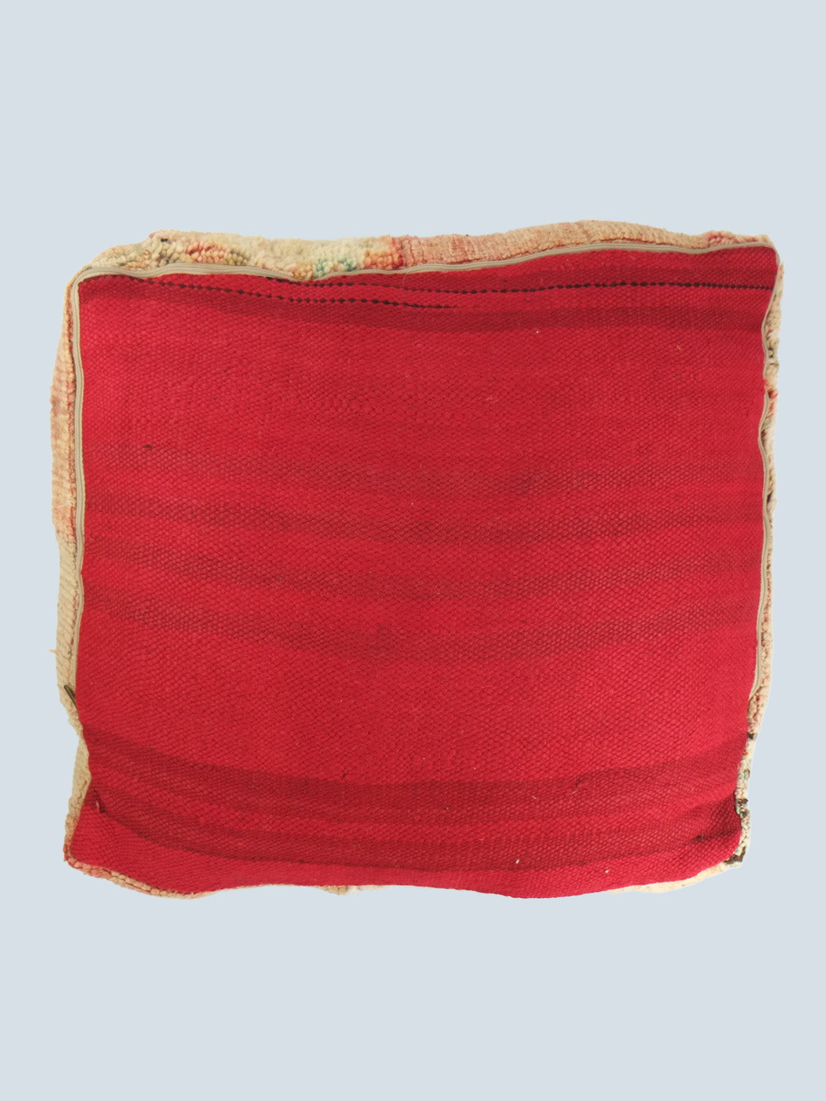This one-of-a-kind floor cushion is made using panels taken from 100% wool Boujad rugs. Four distinct panels in shades from chilli red to soft mauve form the top of the floor cushion while side panels in muted beige and taupe provide contrast. A sturdy deep red, striped cotton backer completes the cushion.