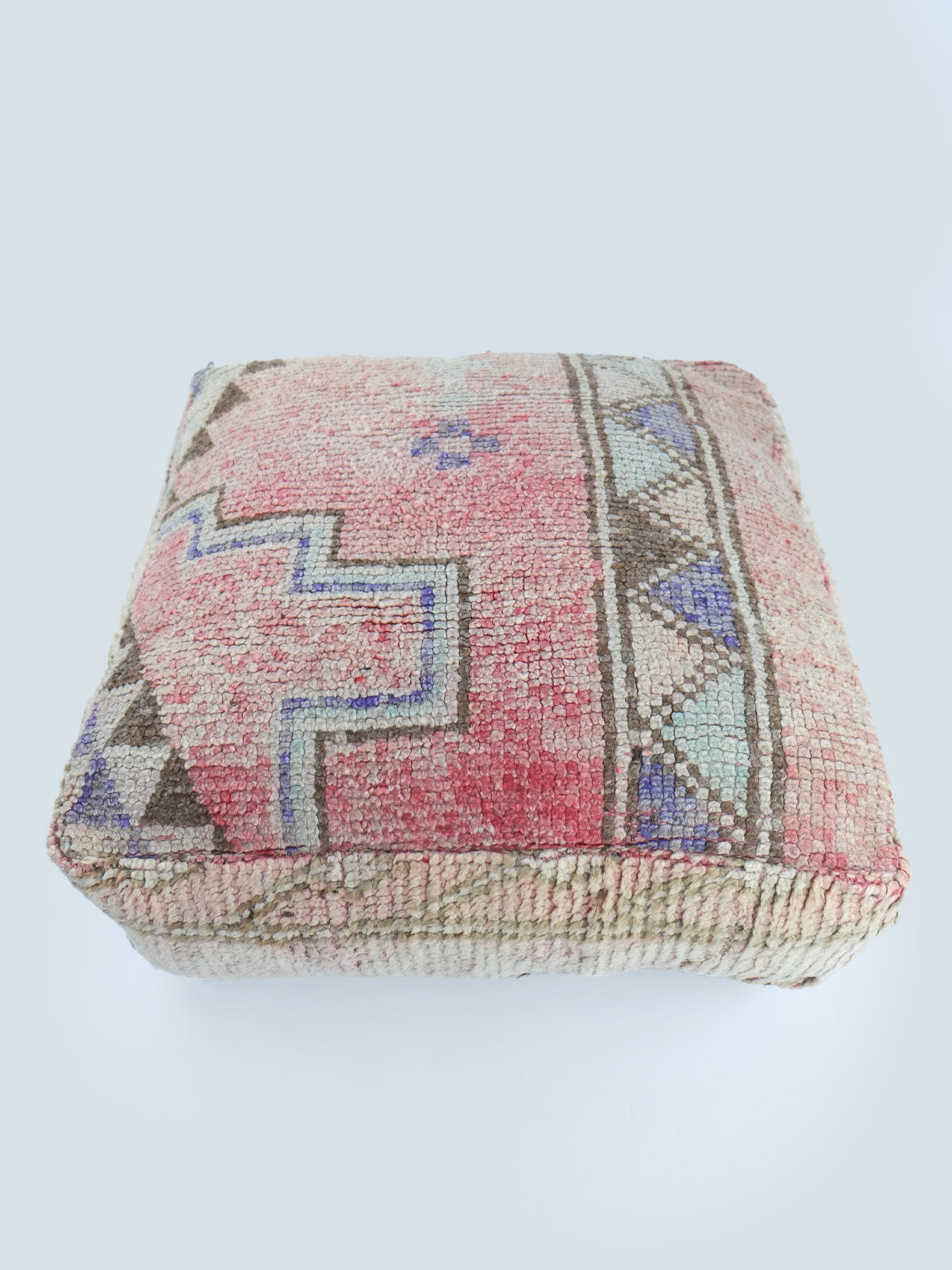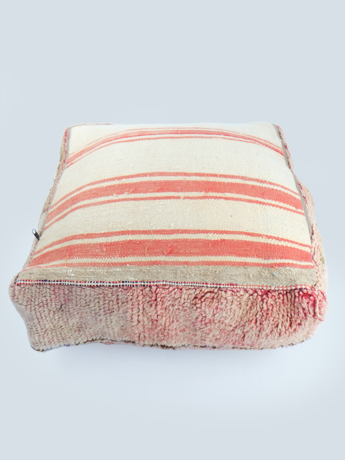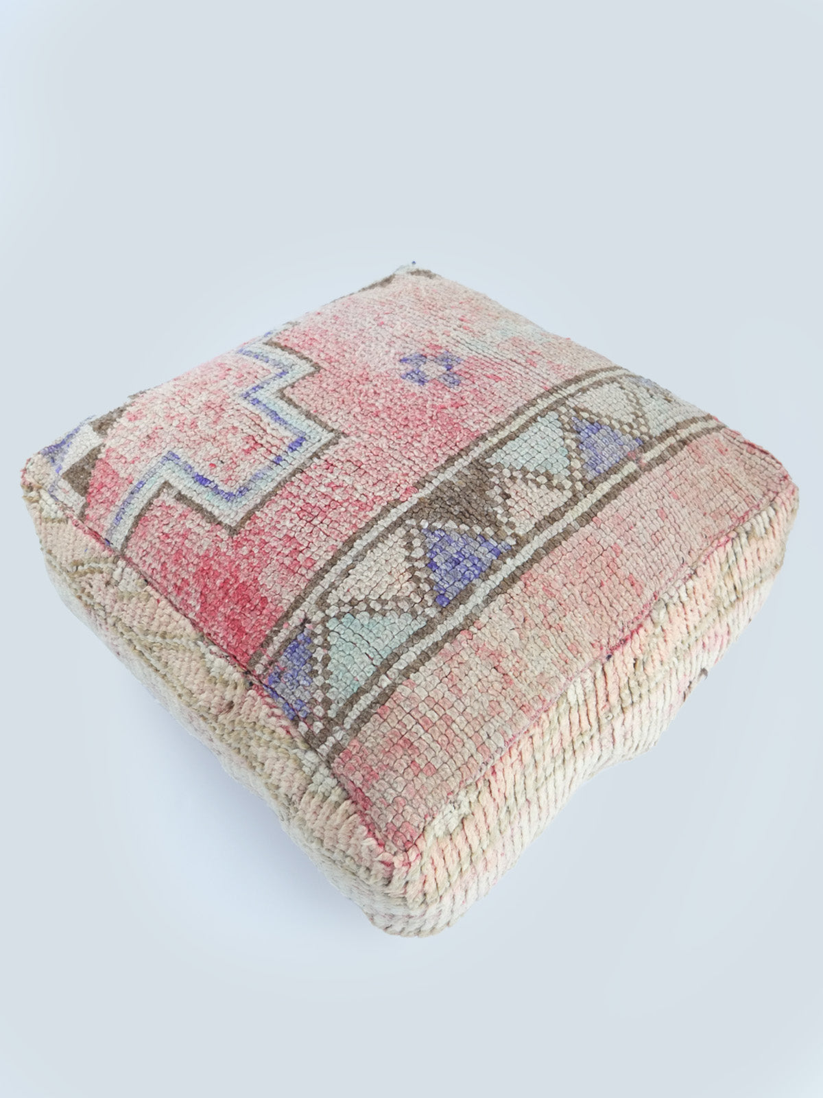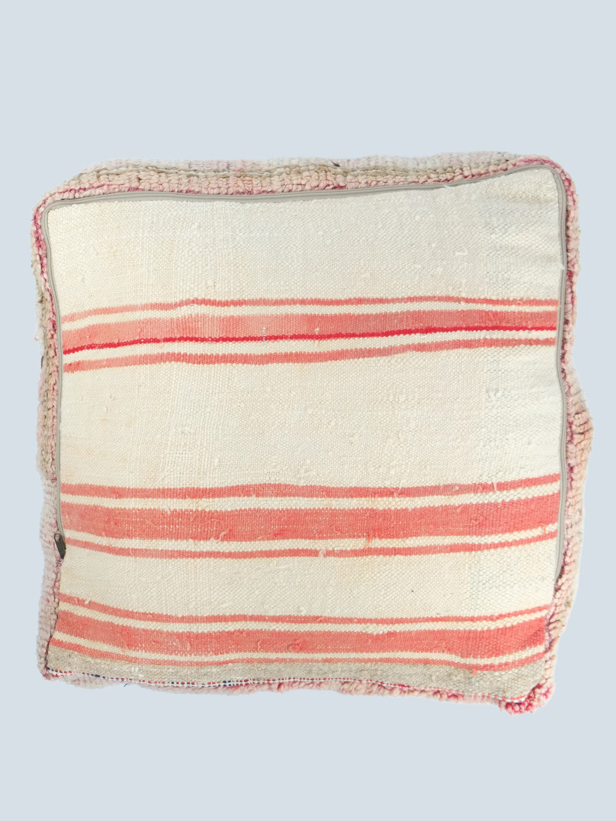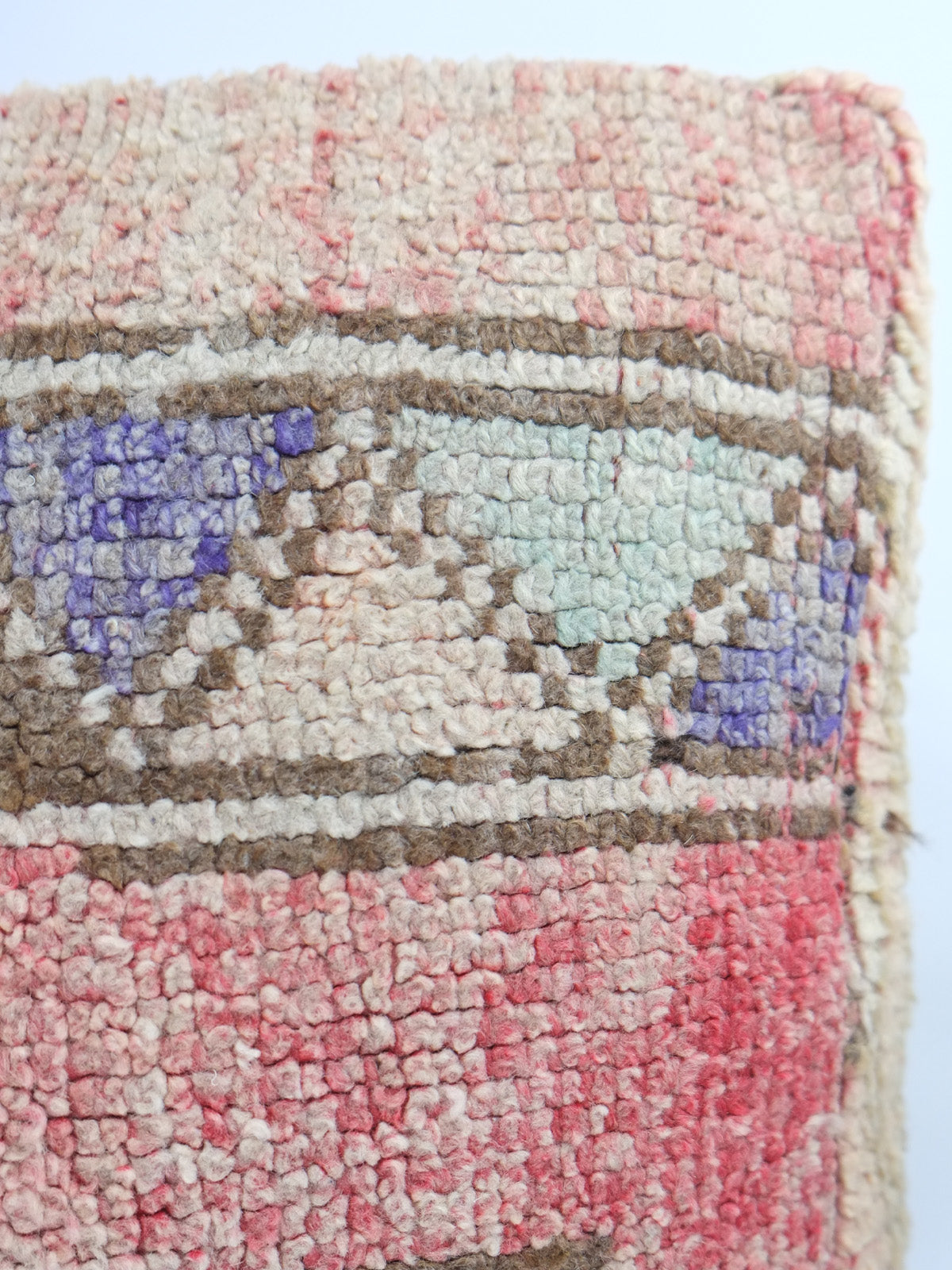 This cushion is made from panels of hand woven Boujad rugs. Triangles and geometric forms in lilac, mint and mocha shades add interest to the blossom pink background. A cream cotton backer with coral stripes creates a sturdy base panel.
